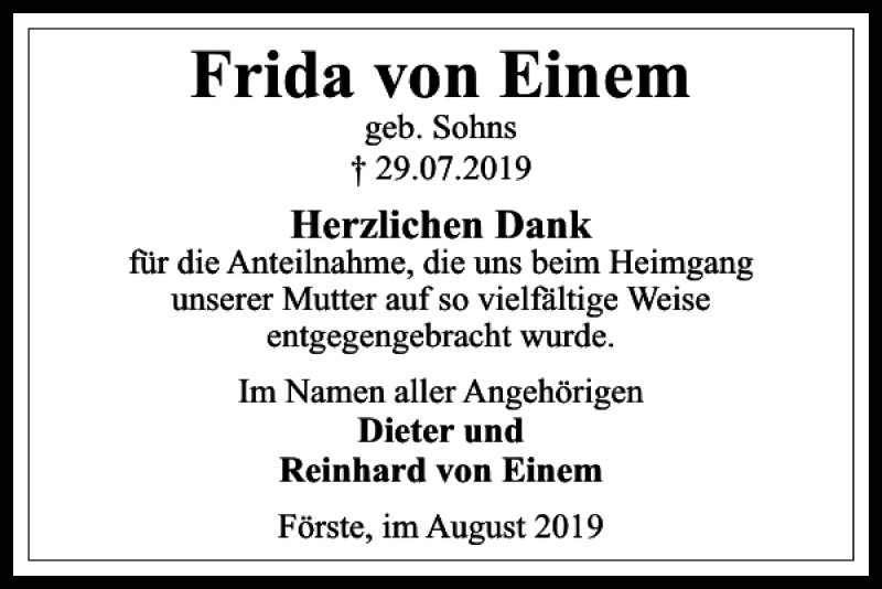 Hier finden Sie alle Traueranzeigen aus der Zeitung, die bisher für Frida von Einem erschienen sind. Weitere Traueranzeigen, die in der Zeitung erscheinen, werden hier ebenfalls aufgelistet