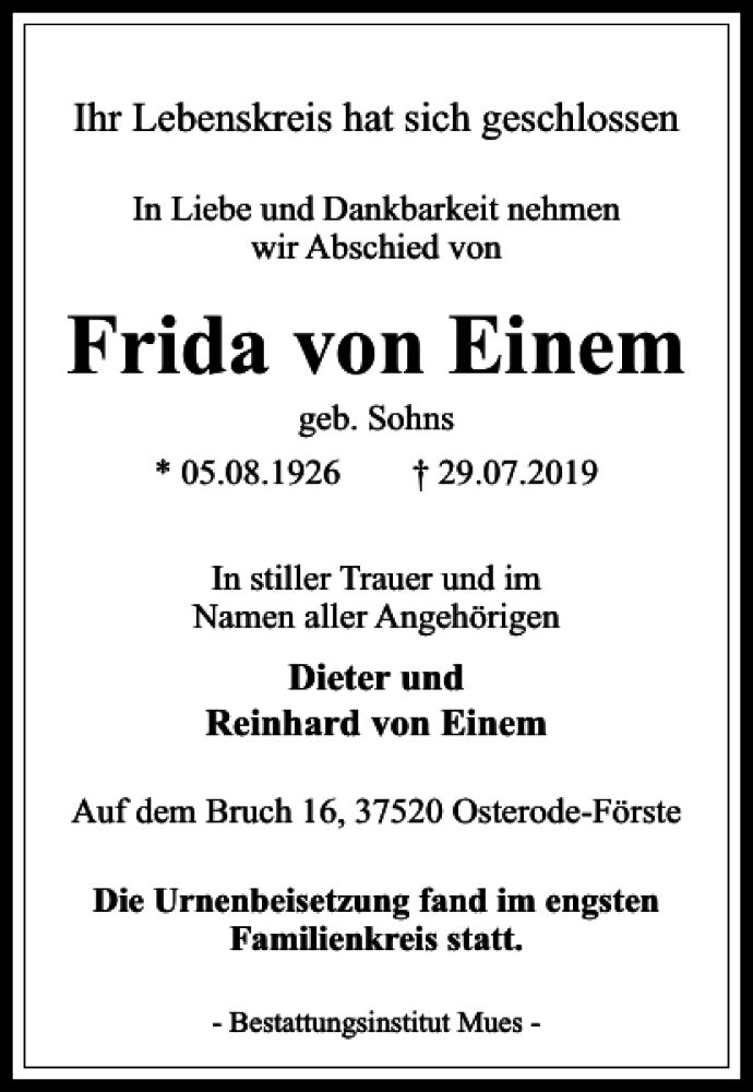 Hier finden Sie alle Traueranzeigen aus der Zeitung, die bisher für Frida von Einem erschienen sind. Weitere Traueranzeigen, die in der Zeitung erscheinen, werden hier ebenfalls aufgelistet