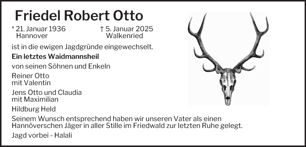 Hier finden Sie alle Traueranzeigen aus der Zeitung, die bisher für Friedel Robert Otto erschienen sind. Weitere Traueranzeigen, die in der Zeitung erscheinen, werden hier ebenfalls aufgelistet