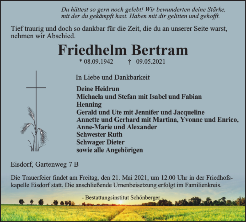 Hier finden Sie alle Traueranzeigen aus der Zeitung, die bisher für Friedhelm Bertram erschienen sind. Weitere Traueranzeigen, die in der Zeitung erscheinen, werden hier ebenfalls aufgelistet