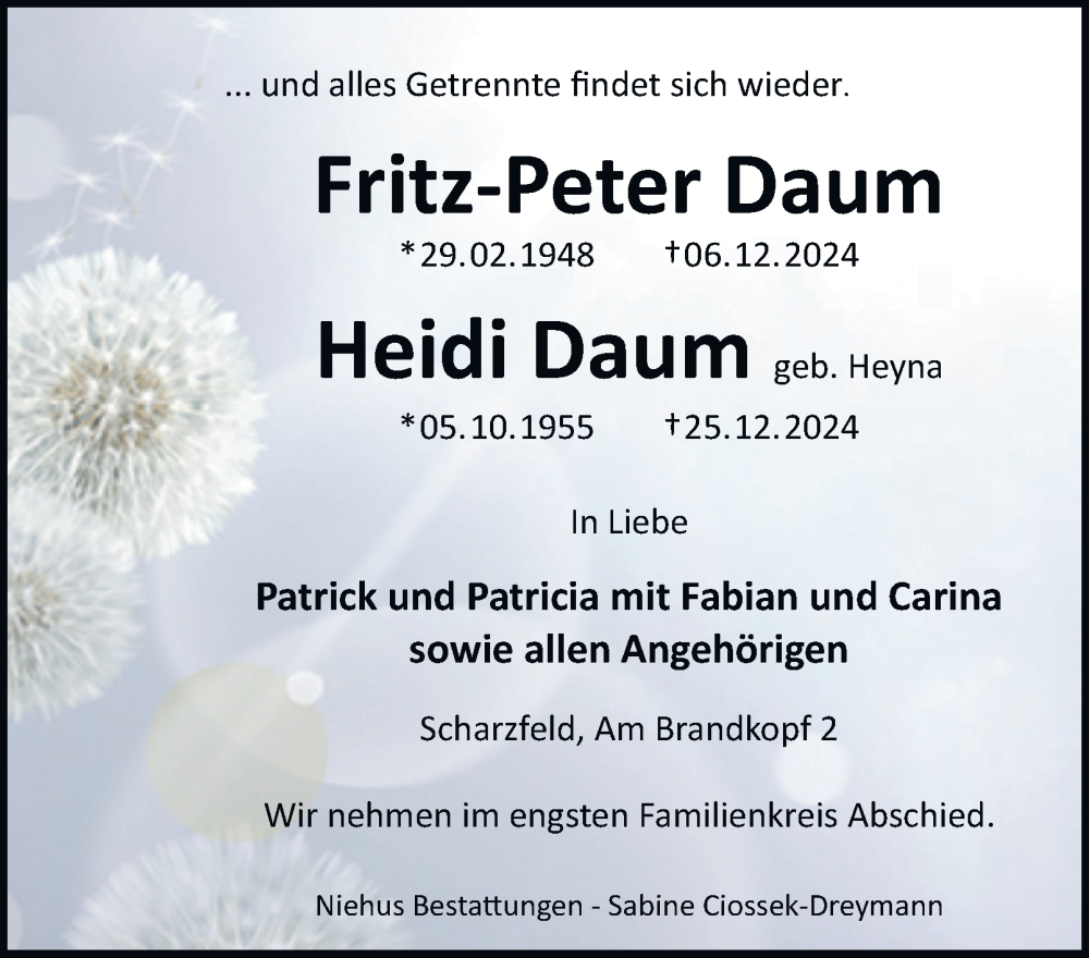 Hier finden Sie alle Traueranzeigen aus der Zeitung, die bisher für Fritz-Peter Daum erschienen sind. Weitere Traueranzeigen, die in der Zeitung erscheinen, werden hier ebenfalls aufgelistet