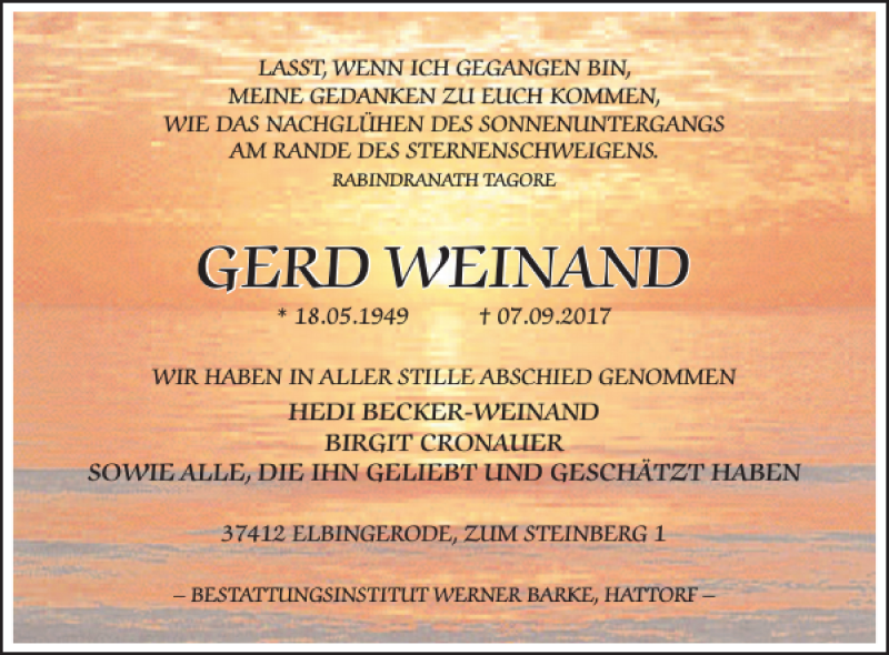 Hier finden Sie alle Traueranzeigen aus der Zeitung, die bisher für GERD WEINAND erschienen sind. Weitere Traueranzeigen, die in der Zeitung erscheinen, werden hier ebenfalls aufgelistet