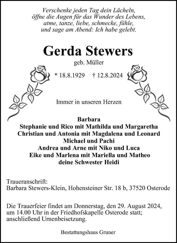 Hier finden Sie alle Traueranzeigen aus der Zeitung, die bisher für Gerda Stewers erschienen sind. Weitere Traueranzeigen, die in der Zeitung erscheinen, werden hier ebenfalls aufgelistet