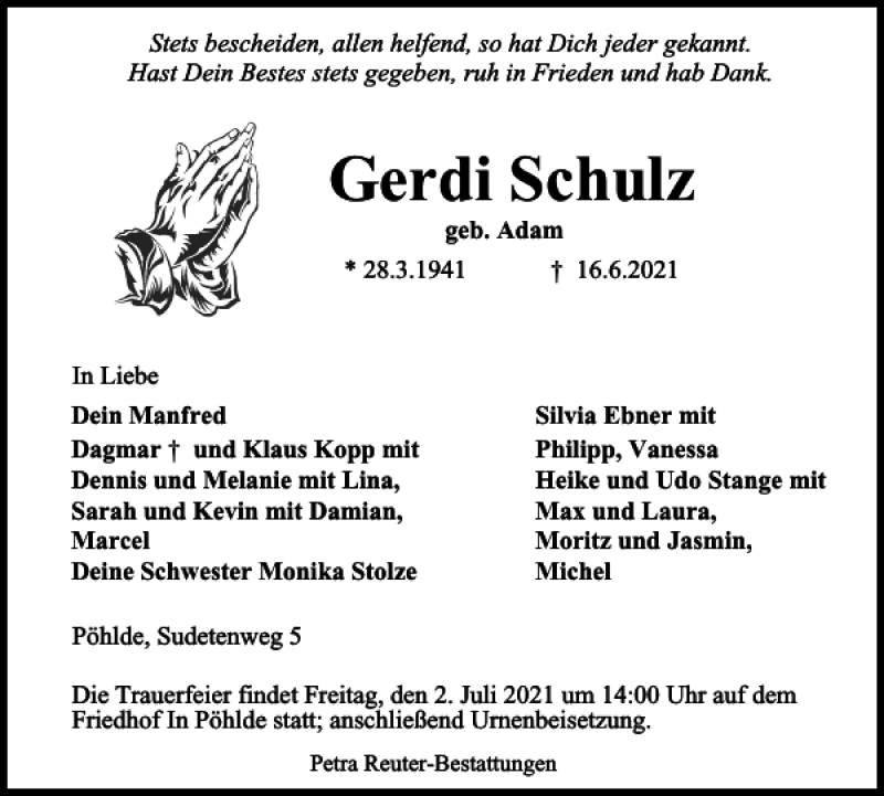Hier finden Sie alle Traueranzeigen aus der Zeitung, die bisher für Gerdi Schulz erschienen sind. Weitere Traueranzeigen, die in der Zeitung erscheinen, werden hier ebenfalls aufgelistet