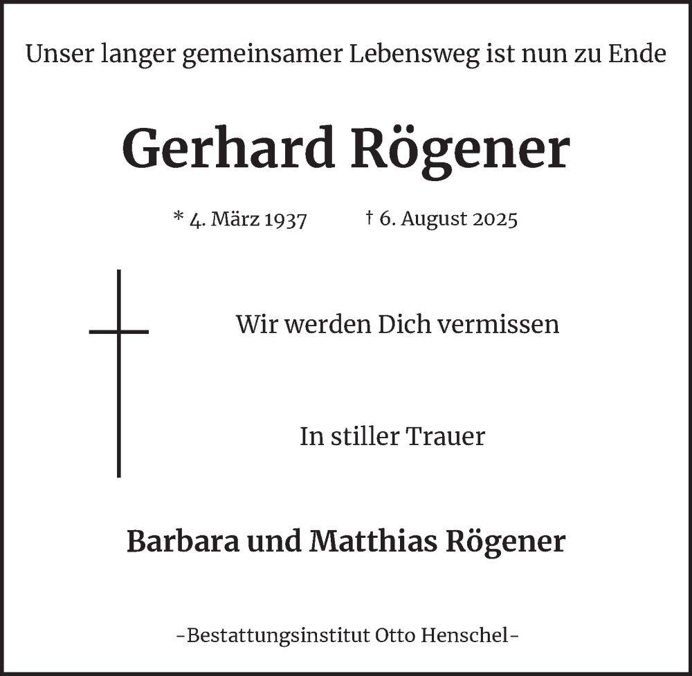 Hier finden Sie alle Traueranzeigen aus der Zeitung, die bisher für Gerhard Rögener erschienen sind. Weitere Traueranzeigen, die in der Zeitung erscheinen, werden hier ebenfalls aufgelistet