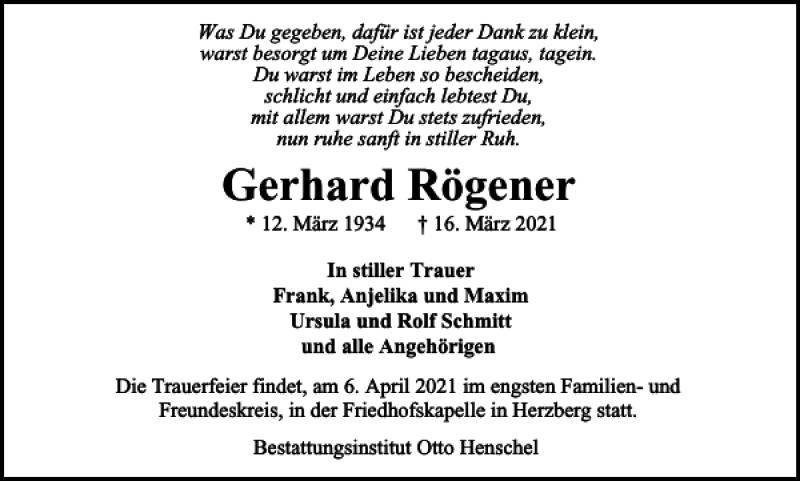 Hier finden Sie alle Traueranzeigen aus der Zeitung, die bisher für Gerhard Rögener erschienen sind. Weitere Traueranzeigen, die in der Zeitung erscheinen, werden hier ebenfalls aufgelistet