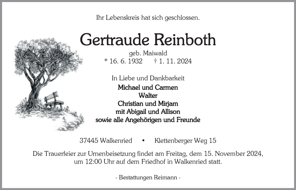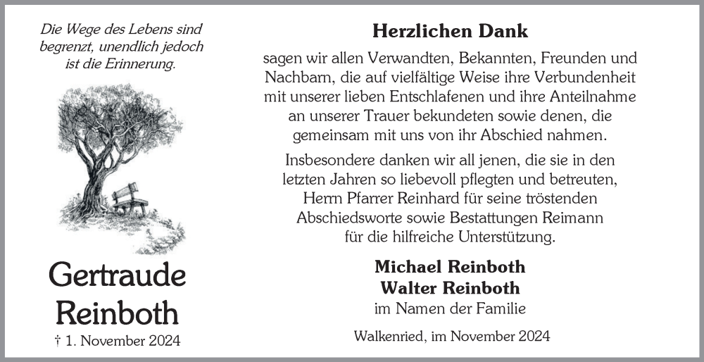 Hier finden Sie alle Traueranzeigen aus der Zeitung, die bisher für Gertraude Reinboth erschienen sind. Weitere Traueranzeigen, die in der Zeitung erscheinen, werden hier ebenfalls aufgelistet