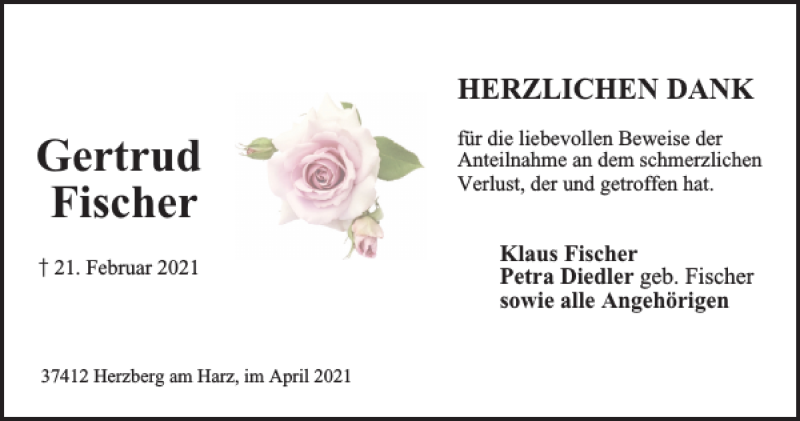 Hier finden Sie alle Traueranzeigen aus der Zeitung, die bisher für Gertrud Fischer erschienen sind. Weitere Traueranzeigen, die in der Zeitung erscheinen, werden hier ebenfalls aufgelistet