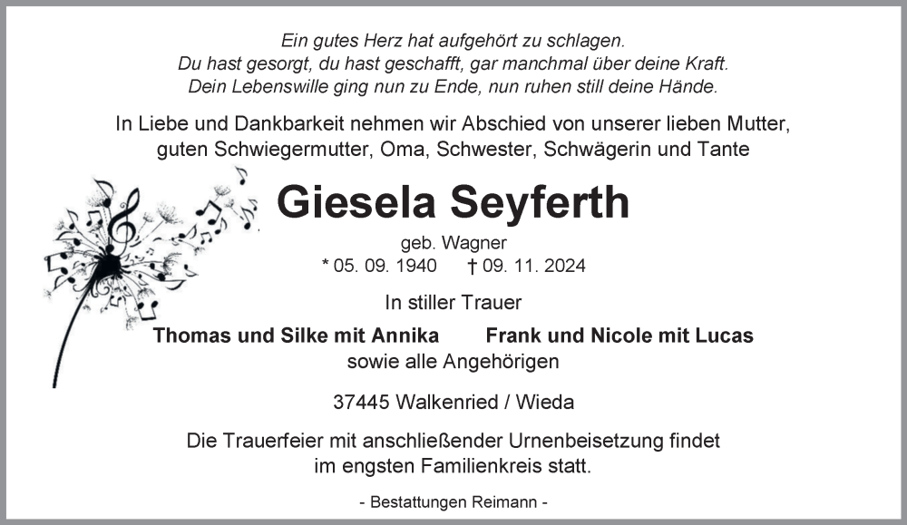 Hier finden Sie alle Traueranzeigen aus der Zeitung, die bisher für Giesela Seyferth erschienen sind. Weitere Traueranzeigen, die in der Zeitung erscheinen, werden hier ebenfalls aufgelistet