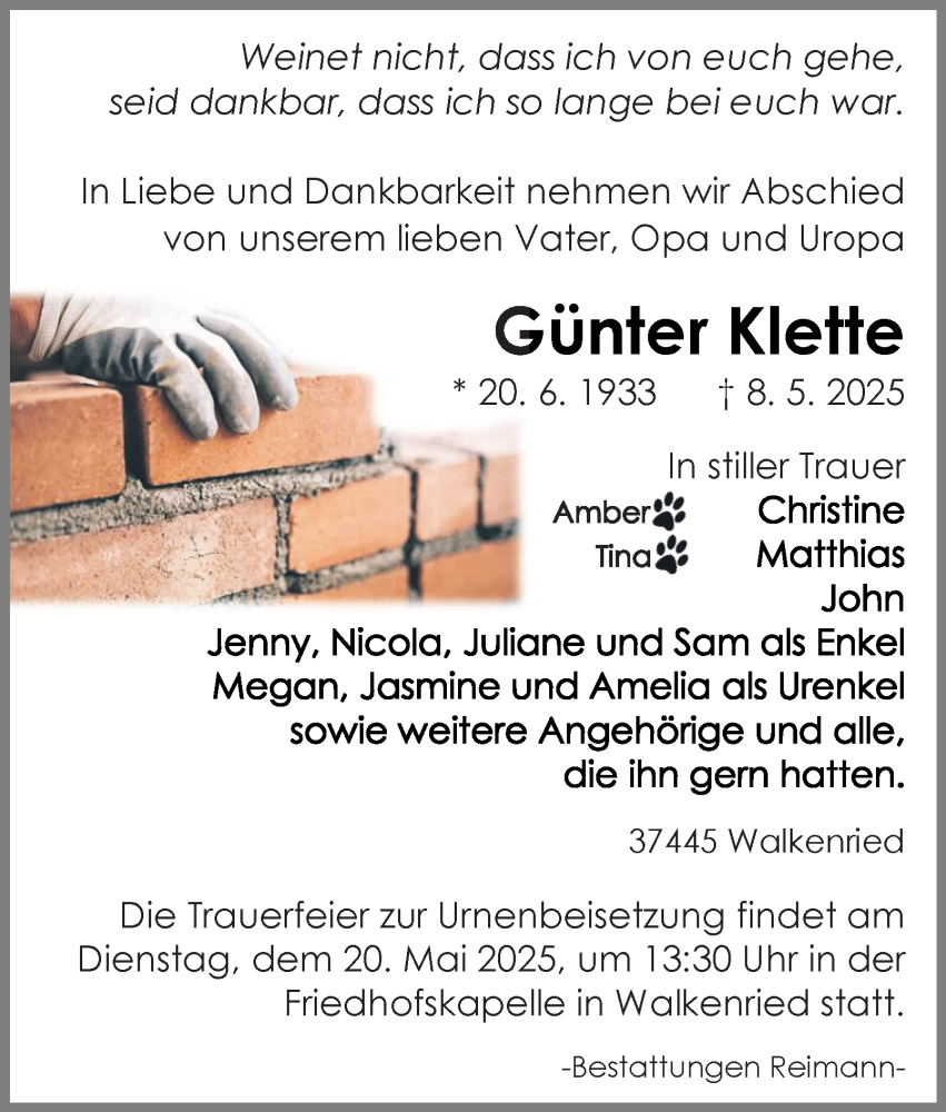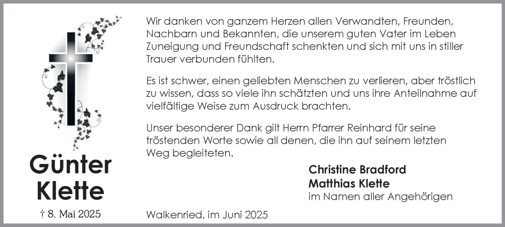 Hier finden Sie alle Traueranzeigen aus der Zeitung, die bisher für Günter Klette erschienen sind. Weitere Traueranzeigen, die in der Zeitung erscheinen, werden hier ebenfalls aufgelistet