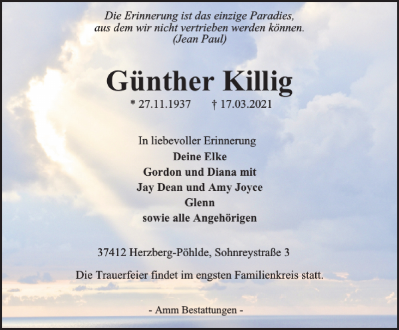 Hier finden Sie alle Traueranzeigen aus der Zeitung, die bisher für Günther Killig erschienen sind. Weitere Traueranzeigen, die in der Zeitung erscheinen, werden hier ebenfalls aufgelistet