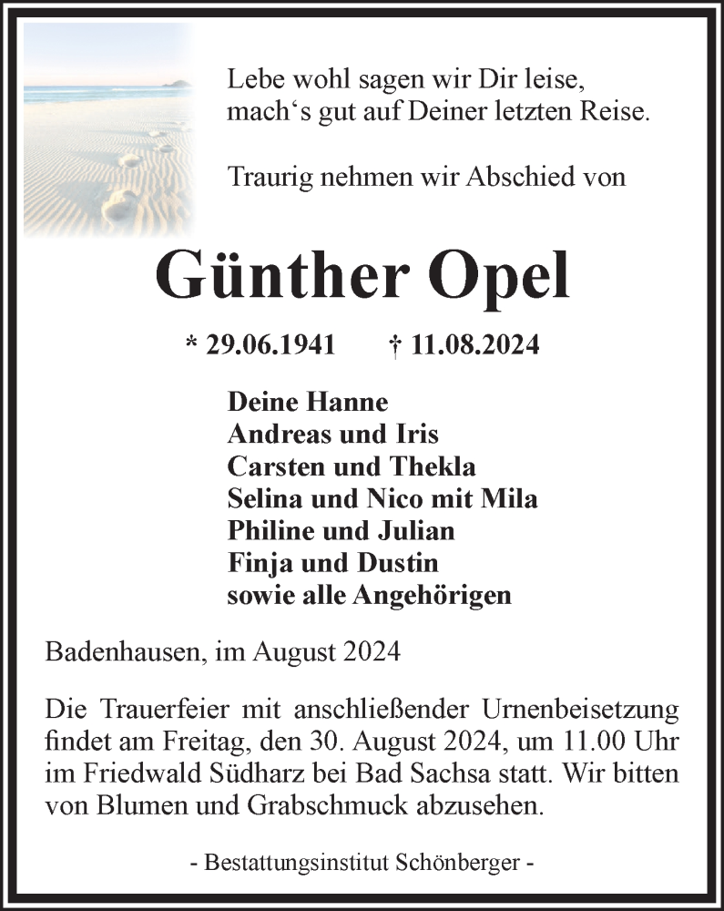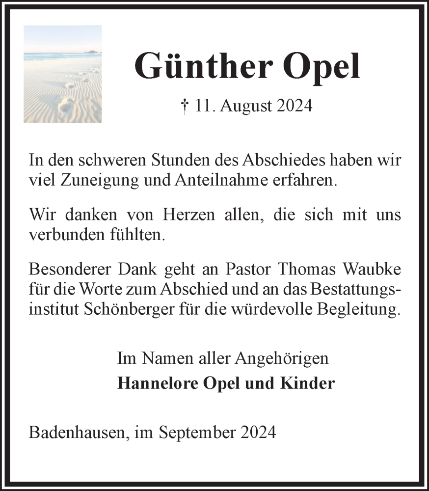 Hier finden Sie alle Traueranzeigen aus der Zeitung, die bisher für Günther Opel erschienen sind. Weitere Traueranzeigen, die in der Zeitung erscheinen, werden hier ebenfalls aufgelistet