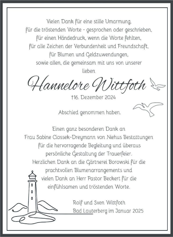 Hier finden Sie alle Traueranzeigen aus der Zeitung, die bisher für Hannelore Wittfoth erschienen sind. Weitere Traueranzeigen, die in der Zeitung erscheinen, werden hier ebenfalls aufgelistet