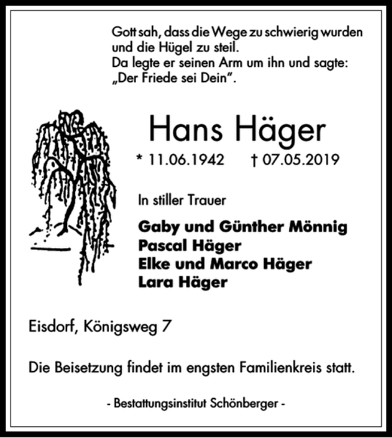 Hier finden Sie alle Traueranzeigen aus der Zeitung, die bisher für Hans Häger erschienen sind. Weitere Traueranzeigen, die in der Zeitung erscheinen, werden hier ebenfalls aufgelistet