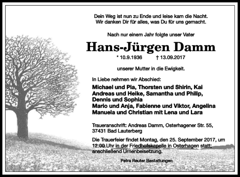 Hier finden Sie alle Traueranzeigen aus der Zeitung, die bisher für Hans-Jürgen Damm erschienen sind. Weitere Traueranzeigen, die in der Zeitung erscheinen, werden hier ebenfalls aufgelistet