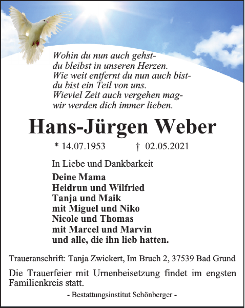 Hier finden Sie alle Traueranzeigen aus der Zeitung, die bisher für Hans-Jürgen Weber erschienen sind. Weitere Traueranzeigen, die in der Zeitung erscheinen, werden hier ebenfalls aufgelistet
