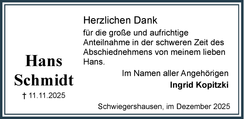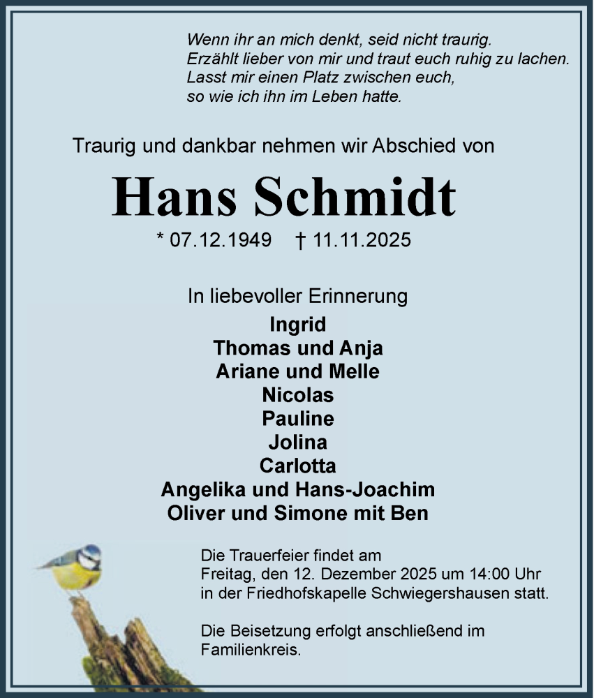 Hier finden Sie alle Traueranzeigen aus der Zeitung, die bisher für Hans Schmidt erschienen sind. Weitere Traueranzeigen, die in der Zeitung erscheinen, werden hier ebenfalls aufgelistet
