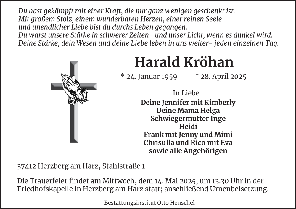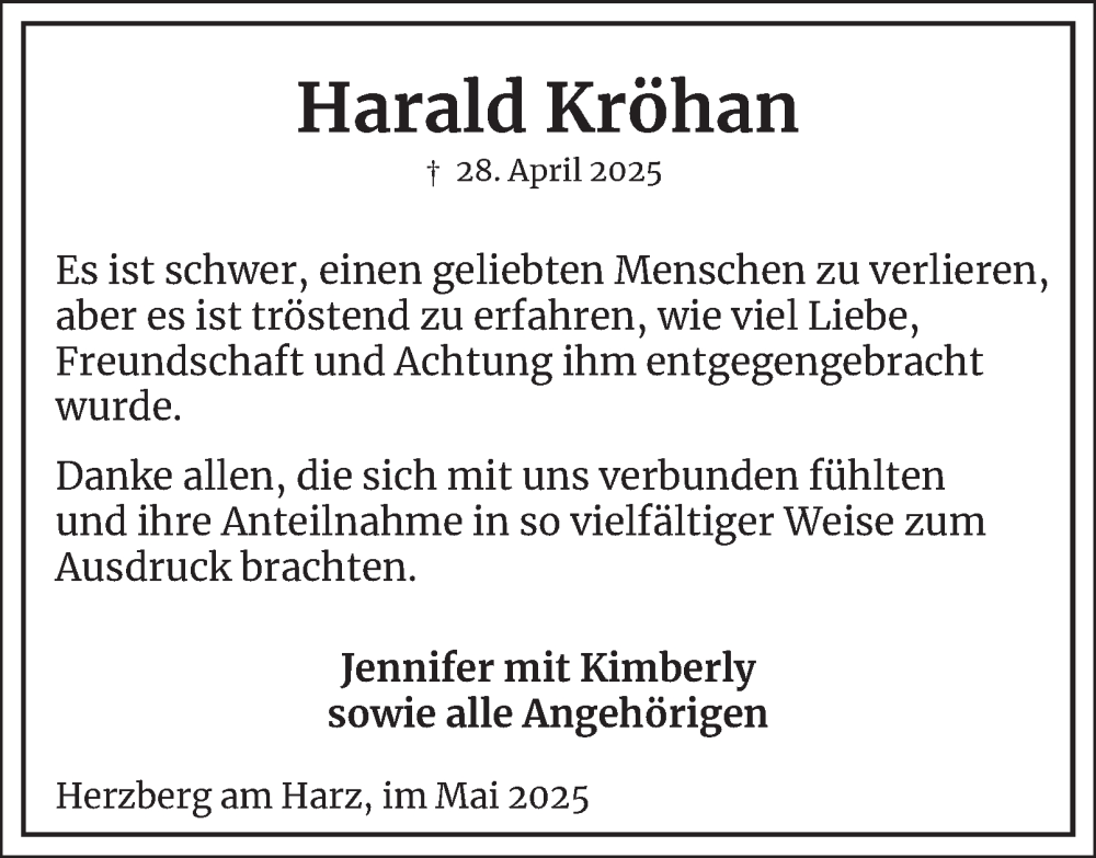 Hier finden Sie alle Traueranzeigen aus der Zeitung, die bisher für Harald Kröhan erschienen sind. Weitere Traueranzeigen, die in der Zeitung erscheinen, werden hier ebenfalls aufgelistet