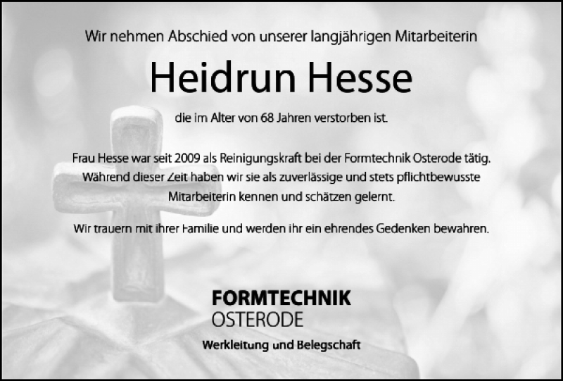 Hier finden Sie alle Traueranzeigen aus der Zeitung, die bisher für Heidrun Hesse erschienen sind. Weitere Traueranzeigen, die in der Zeitung erscheinen, werden hier ebenfalls aufgelistet
