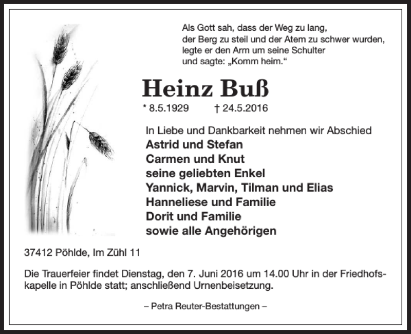 Hier finden Sie alle Traueranzeigen aus der Zeitung, die bisher für Heinz Buß erschienen sind. Weitere Traueranzeigen, die in der Zeitung erscheinen, werden hier ebenfalls aufgelistet