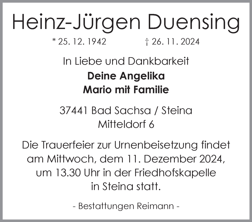Hier finden Sie alle Traueranzeigen aus der Zeitung, die bisher für Heinz-Jürgen Duensing erschienen sind. Weitere Traueranzeigen, die in der Zeitung erscheinen, werden hier ebenfalls aufgelistet