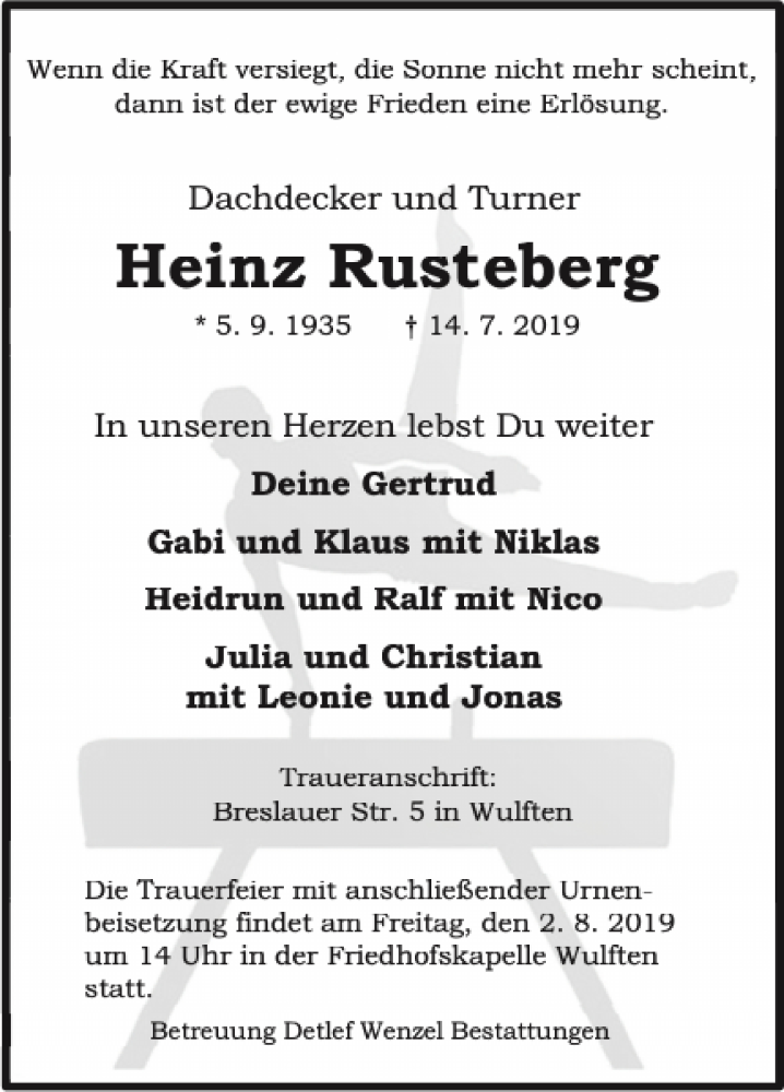 Hier finden Sie alle Traueranzeigen aus der Zeitung, die bisher für Heinz Rusteberg erschienen sind. Weitere Traueranzeigen, die in der Zeitung erscheinen, werden hier ebenfalls aufgelistet