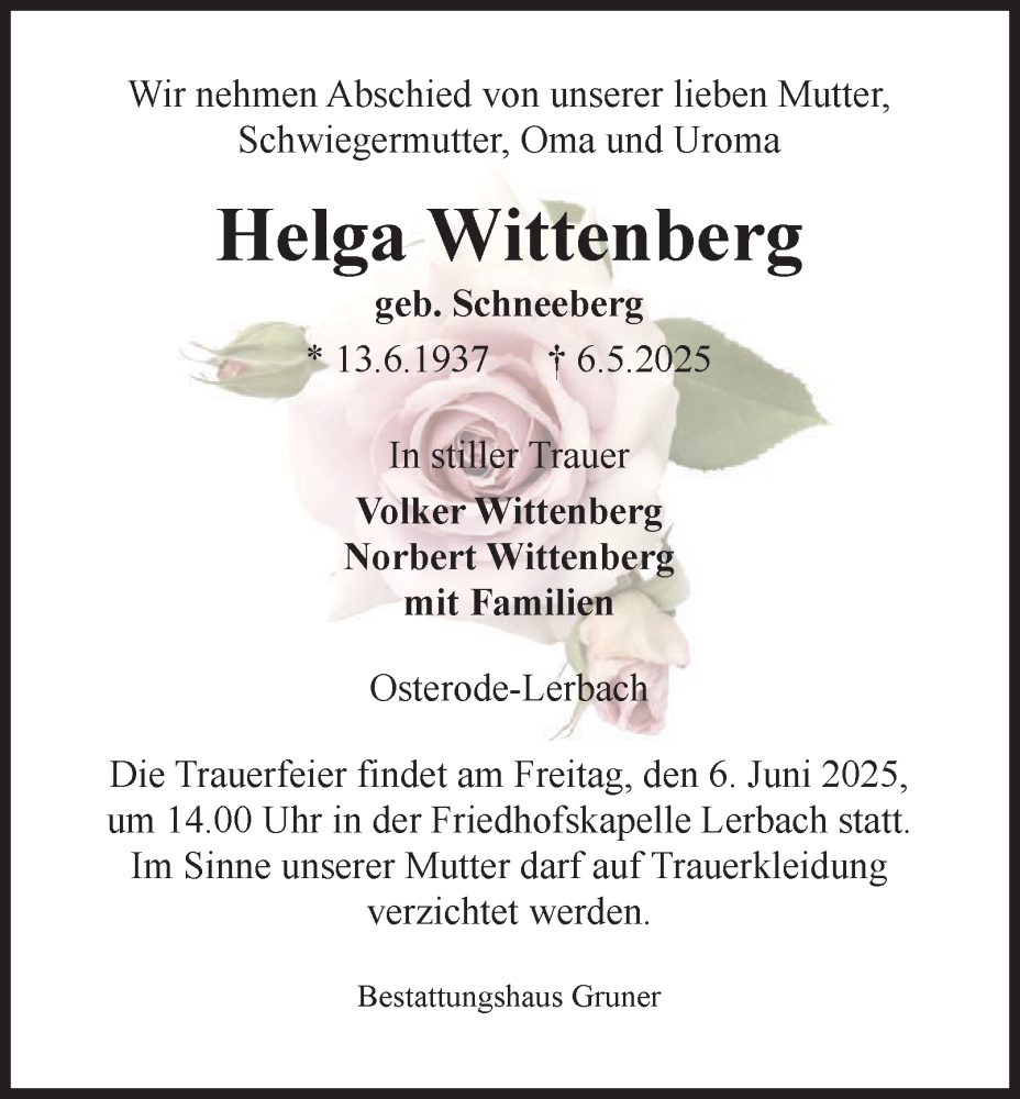 Hier finden Sie alle Traueranzeigen aus der Zeitung, die bisher für Helga Wittenberg erschienen sind. Weitere Traueranzeigen, die in der Zeitung erscheinen, werden hier ebenfalls aufgelistet