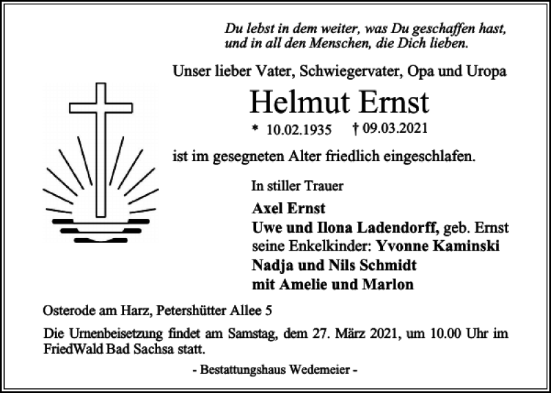 Hier finden Sie alle Traueranzeigen aus der Zeitung, die bisher für Helmut Ernst erschienen sind. Weitere Traueranzeigen, die in der Zeitung erscheinen, werden hier ebenfalls aufgelistet