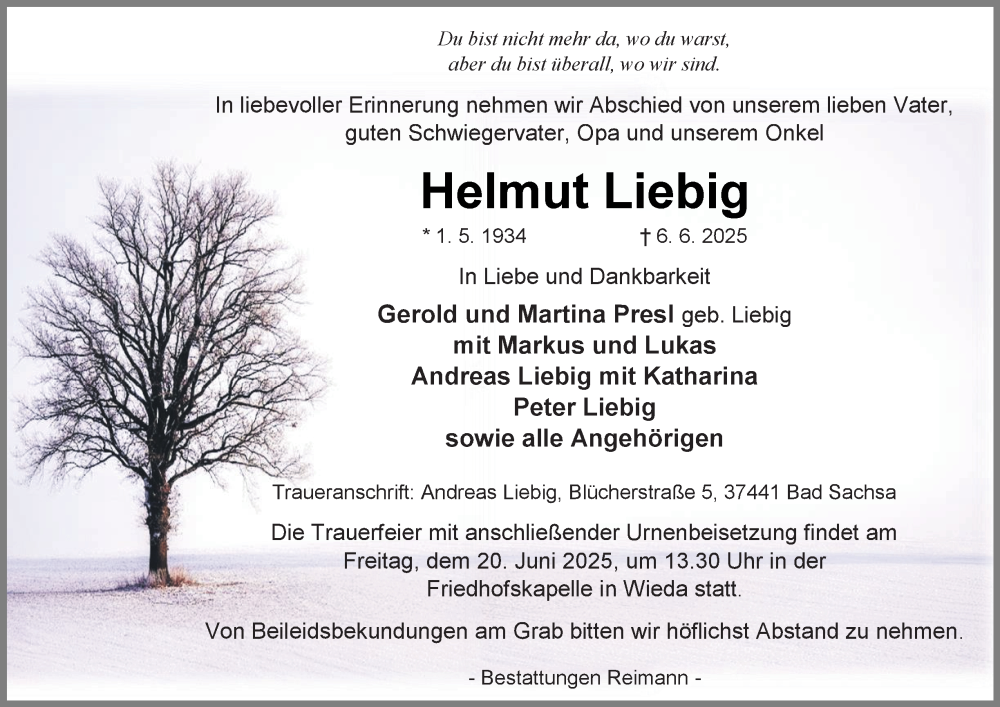 Hier finden Sie alle Traueranzeigen aus der Zeitung, die bisher für Helmut Liebig erschienen sind. Weitere Traueranzeigen, die in der Zeitung erscheinen, werden hier ebenfalls aufgelistet