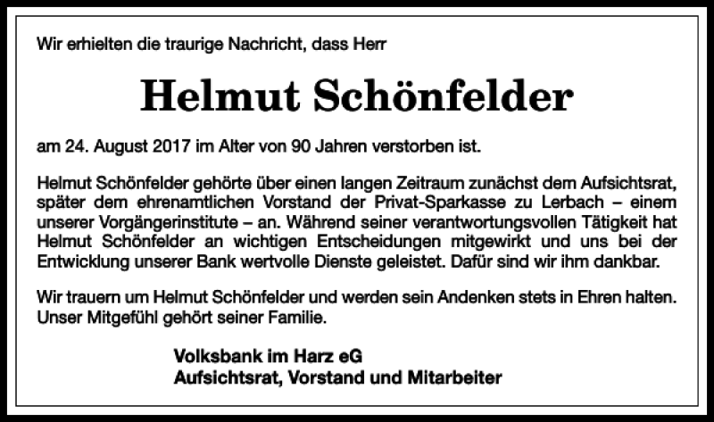 Hier finden Sie alle Traueranzeigen aus der Zeitung, die bisher für Helmut Schönfelder erschienen sind. Weitere Traueranzeigen, die in der Zeitung erscheinen, werden hier ebenfalls aufgelistet