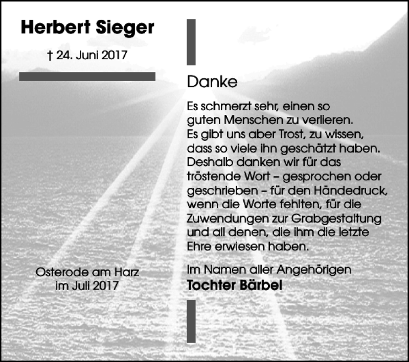 Hier finden Sie alle Traueranzeigen aus der Zeitung, die bisher für Herbert Sieger erschienen sind. Weitere Traueranzeigen, die in der Zeitung erscheinen, werden hier ebenfalls aufgelistet