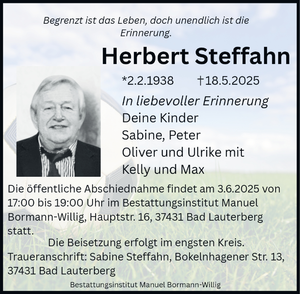 Hier finden Sie alle Traueranzeigen aus der Zeitung, die bisher für Herbert Steffahn erschienen sind. Weitere Traueranzeigen, die in der Zeitung erscheinen, werden hier ebenfalls aufgelistet