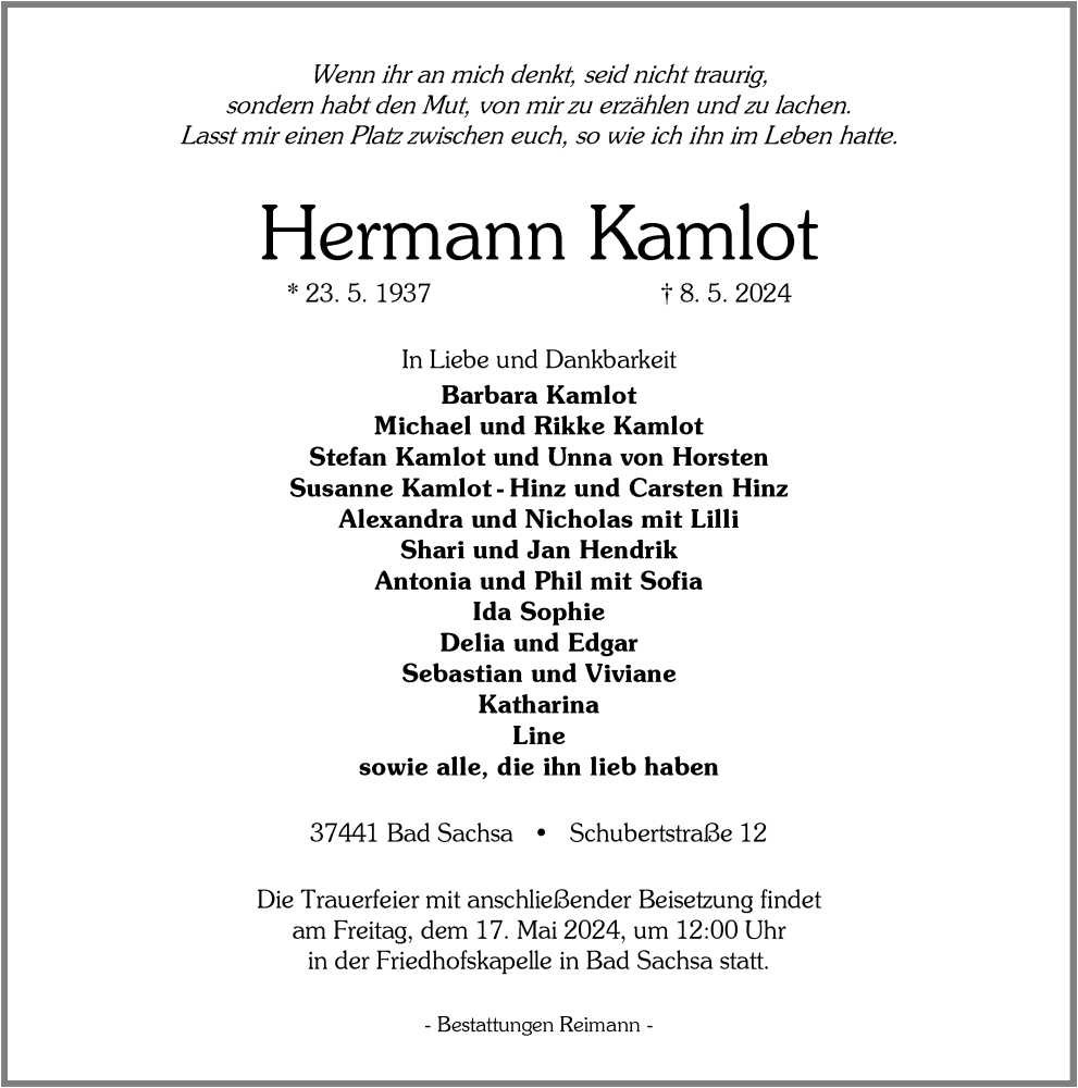 Hier finden Sie alle Traueranzeigen aus der Zeitung, die bisher für Hermann Kamlot erschienen sind. Weitere Traueranzeigen, die in der Zeitung erscheinen, werden hier ebenfalls aufgelistet