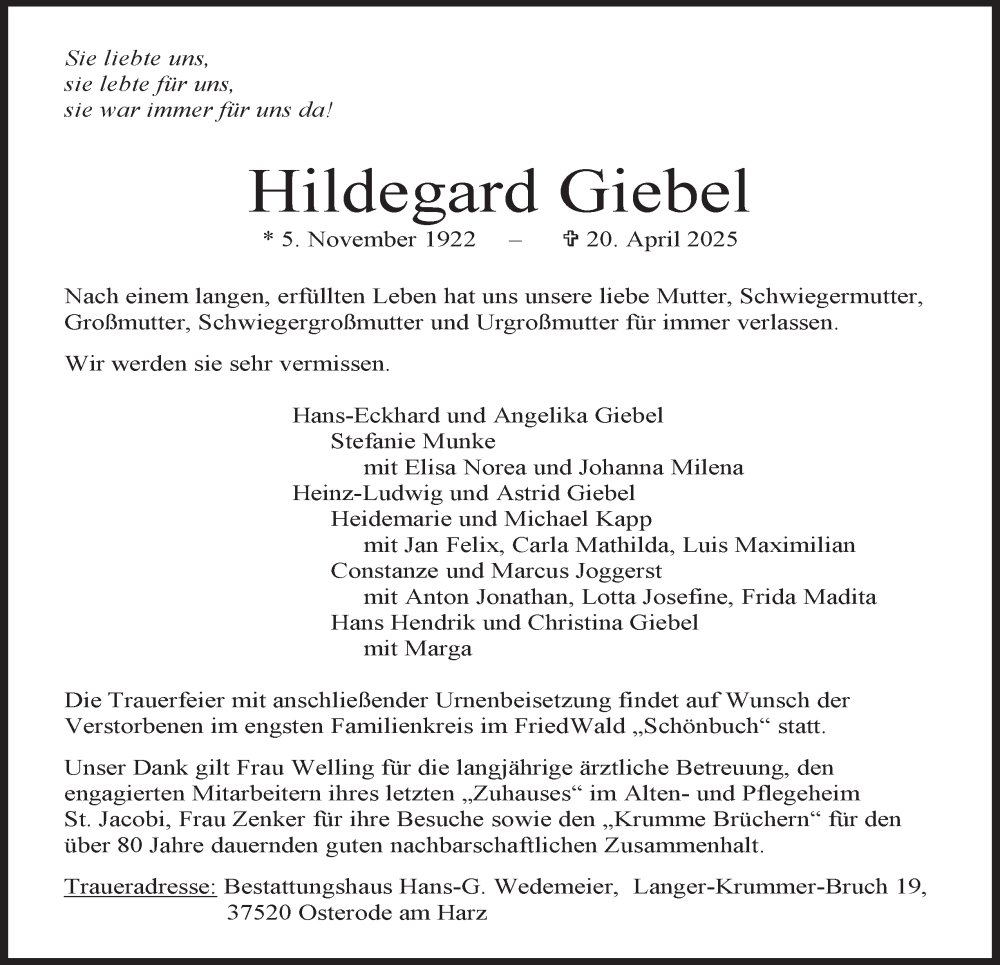 Hier finden Sie alle Traueranzeigen aus der Zeitung, die bisher für Hildegard Giebel erschienen sind. Weitere Traueranzeigen, die in der Zeitung erscheinen, werden hier ebenfalls aufgelistet