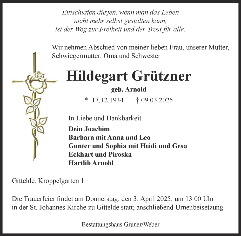 Hier finden Sie alle Traueranzeigen aus der Zeitung, die bisher für Hildegart Grützner erschienen sind. Weitere Traueranzeigen, die in der Zeitung erscheinen, werden hier ebenfalls aufgelistet