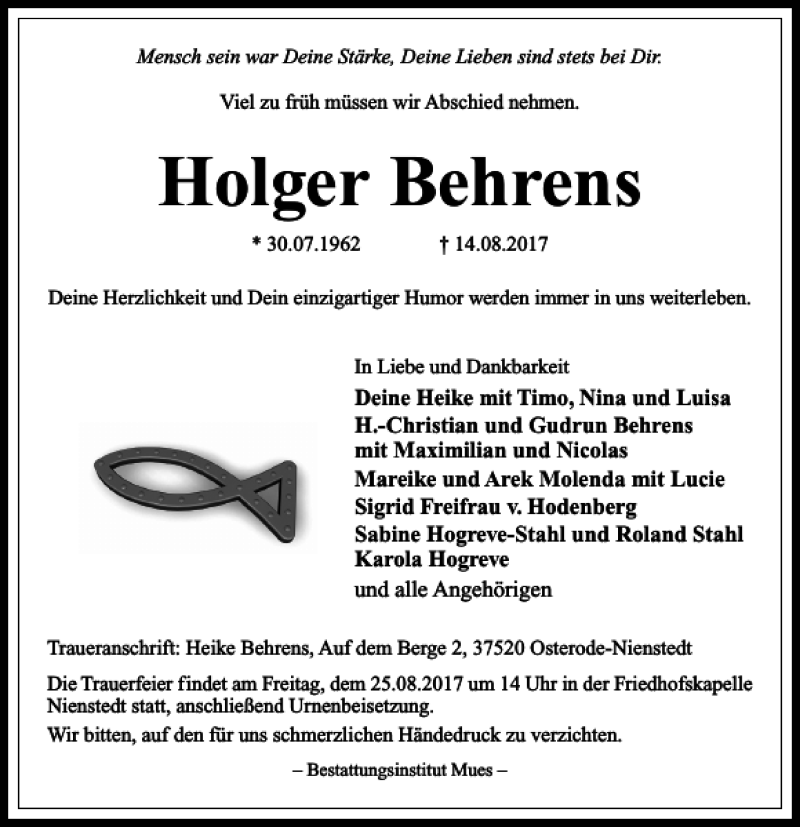 Hier finden Sie alle Traueranzeigen aus der Zeitung, die bisher für Holger Behrens erschienen sind. Weitere Traueranzeigen, die in der Zeitung erscheinen, werden hier ebenfalls aufgelistet