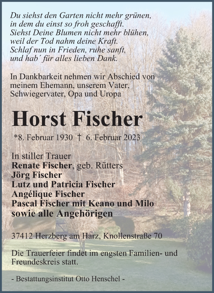 Hier finden Sie alle Traueranzeigen aus der Zeitung, die bisher für Horst Fischer erschienen sind. Weitere Traueranzeigen, die in der Zeitung erscheinen, werden hier ebenfalls aufgelistet
