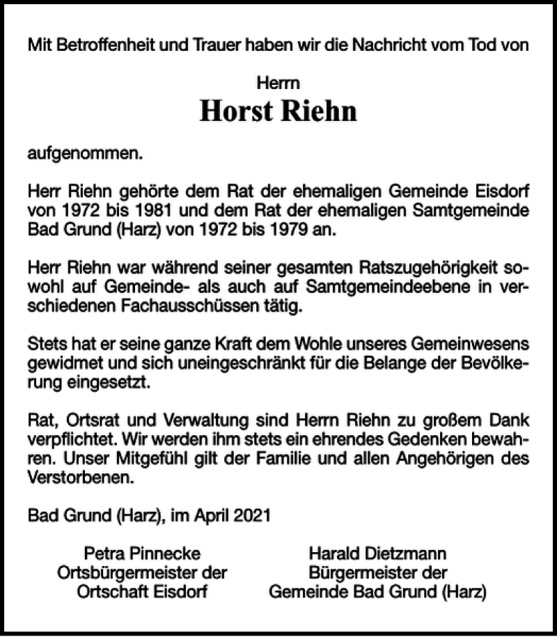 Hier finden Sie alle Traueranzeigen aus der Zeitung, die bisher für Horst Riehn erschienen sind. Weitere Traueranzeigen, die in der Zeitung erscheinen, werden hier ebenfalls aufgelistet