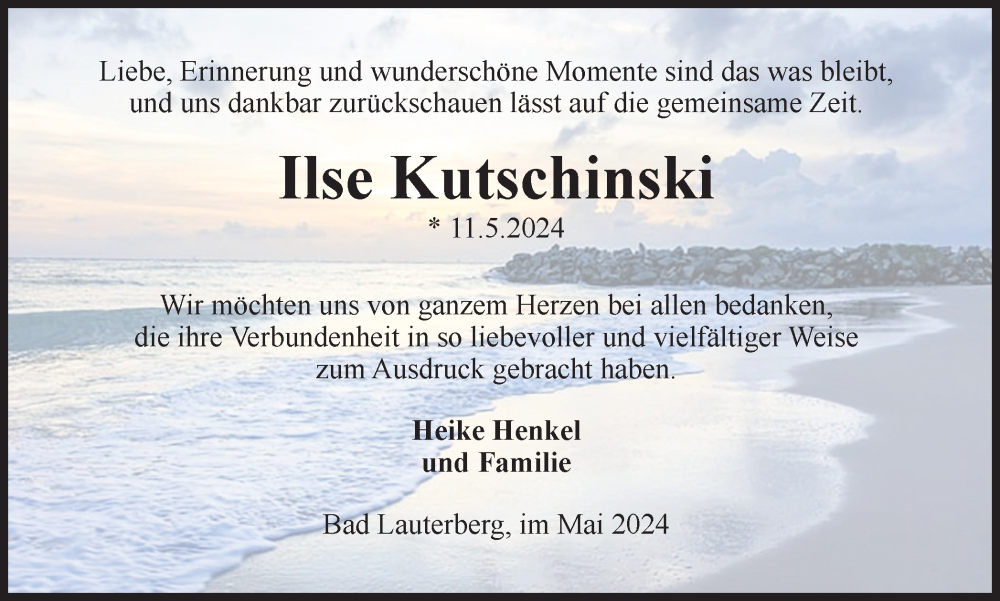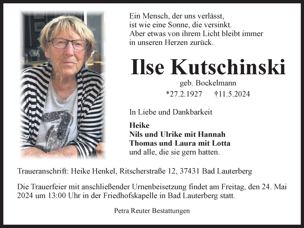 Hier finden Sie alle Traueranzeigen aus der Zeitung, die bisher für Ilse Kutschinski erschienen sind. Weitere Traueranzeigen, die in der Zeitung erscheinen, werden hier ebenfalls aufgelistet
