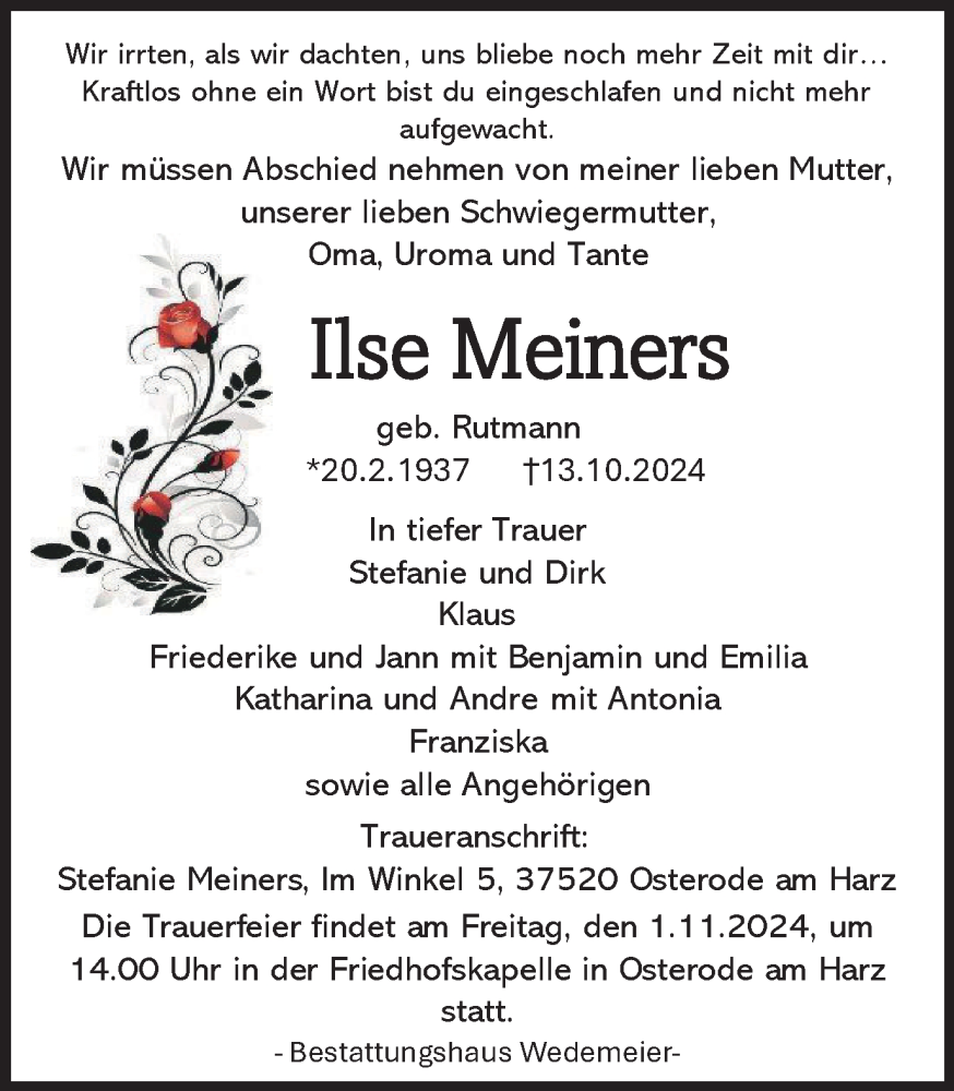 Hier finden Sie alle Traueranzeigen aus der Zeitung, die bisher für Ilse Meiners erschienen sind. Weitere Traueranzeigen, die in der Zeitung erscheinen, werden hier ebenfalls aufgelistet