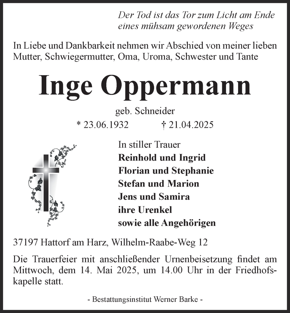 Hier finden Sie alle Traueranzeigen aus der Zeitung, die bisher für Inge Oppermann erschienen sind. Weitere Traueranzeigen, die in der Zeitung erscheinen, werden hier ebenfalls aufgelistet