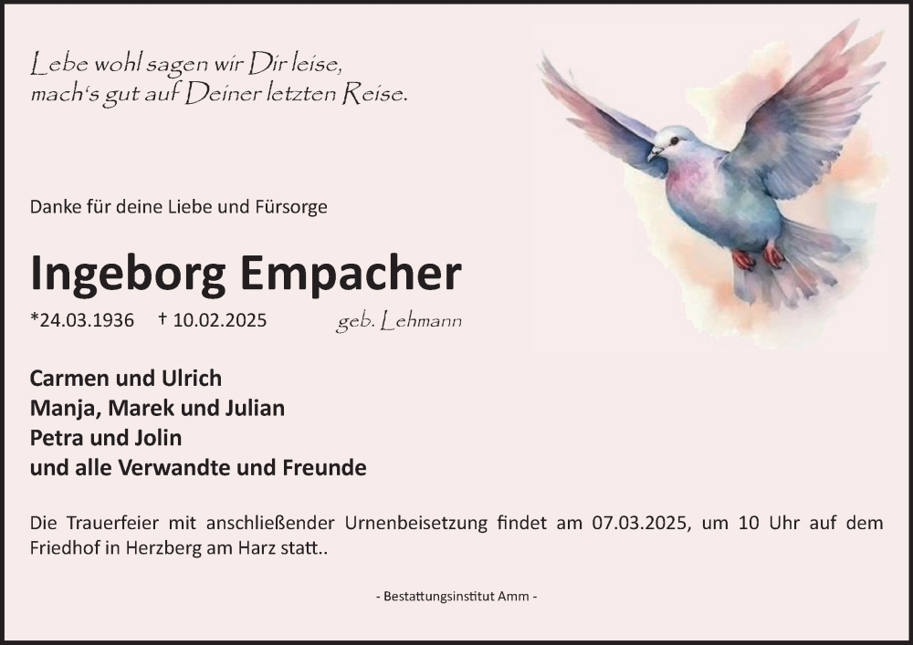 Hier finden Sie alle Traueranzeigen aus der Zeitung, die bisher für Ingeborg Empacher erschienen sind. Weitere Traueranzeigen, die in der Zeitung erscheinen, werden hier ebenfalls aufgelistet
