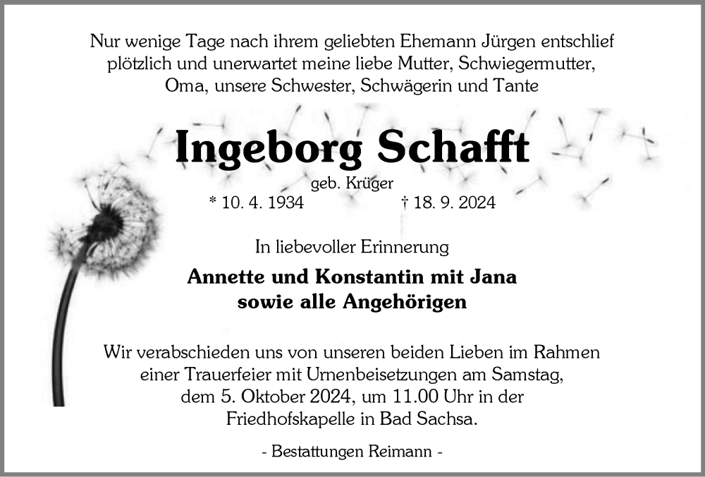 Hier finden Sie alle Traueranzeigen aus der Zeitung, die bisher für Ingeborg Schafft erschienen sind. Weitere Traueranzeigen, die in der Zeitung erscheinen, werden hier ebenfalls aufgelistet