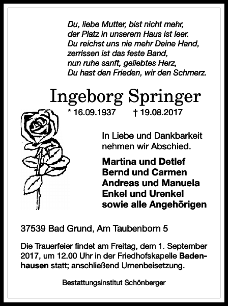Hier finden Sie alle Traueranzeigen aus der Zeitung, die bisher für Ingeborg Springer erschienen sind. Weitere Traueranzeigen, die in der Zeitung erscheinen, werden hier ebenfalls aufgelistet