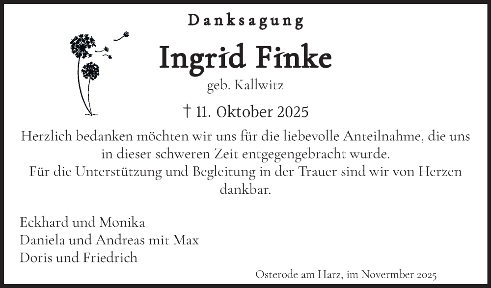 Hier finden Sie alle Traueranzeigen aus der Zeitung, die bisher für Ingrid Finke erschienen sind. Weitere Traueranzeigen, die in der Zeitung erscheinen, werden hier ebenfalls aufgelistet