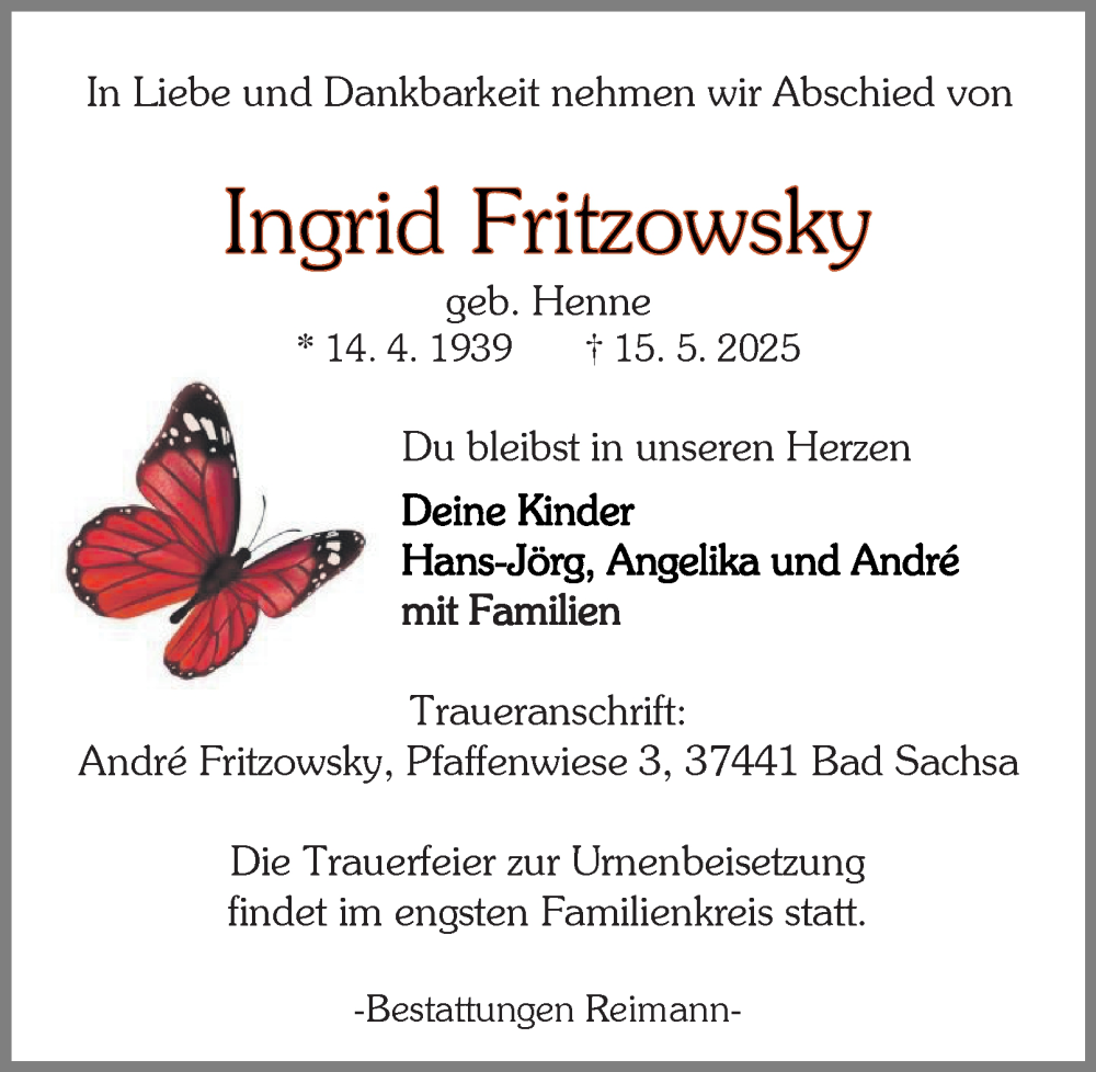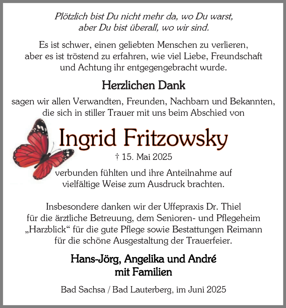 Hier finden Sie alle Traueranzeigen aus der Zeitung, die bisher für Ingrid Fritzowsky erschienen sind. Weitere Traueranzeigen, die in der Zeitung erscheinen, werden hier ebenfalls aufgelistet