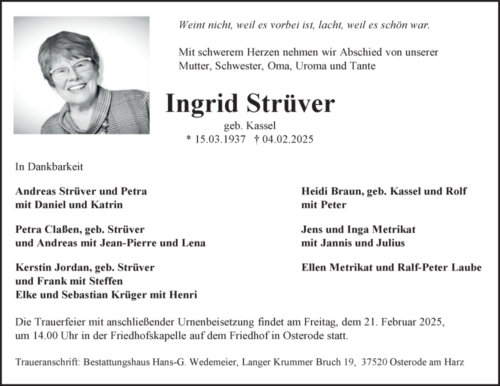 Hier finden Sie alle Traueranzeigen aus der Zeitung, die bisher für Ingrid Strüver erschienen sind. Weitere Traueranzeigen, die in der Zeitung erscheinen, werden hier ebenfalls aufgelistet