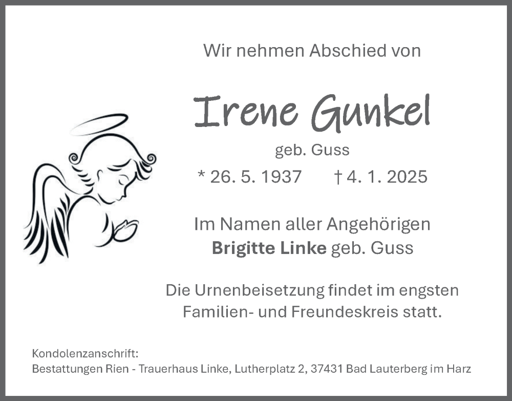 Hier finden Sie alle Traueranzeigen aus der Zeitung, die bisher für Irene Gunkel erschienen sind. Weitere Traueranzeigen, die in der Zeitung erscheinen, werden hier ebenfalls aufgelistet