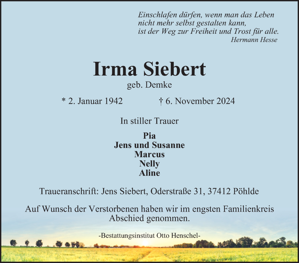 Hier finden Sie alle Traueranzeigen aus der Zeitung, die bisher für Irma Siebert erschienen sind. Weitere Traueranzeigen, die in der Zeitung erscheinen, werden hier ebenfalls aufgelistet