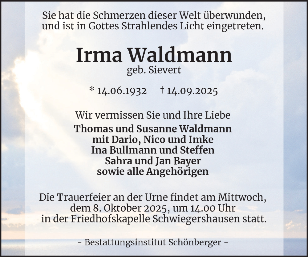 Hier finden Sie alle Traueranzeigen aus der Zeitung, die bisher für Irma Waldmann erschienen sind. Weitere Traueranzeigen, die in der Zeitung erscheinen, werden hier ebenfalls aufgelistet
